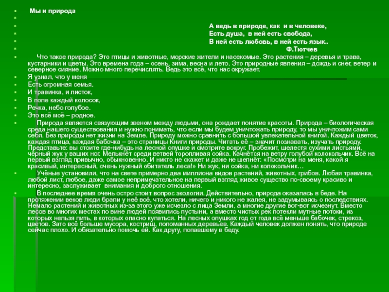 Природа является связующим звеном между людьми, она рождает понятие красоты. Природа – биологическая среда нашего существования и нужно понимать, что если мы будем уничтожать природу, то мы уничтожим сами себя. Без природы нет жизни на Земле. Природу можно сравнить с большой увлекательной книгой. Каждый цветок, каждая птица, каждая бабочка – это страницы Книги природы. Читать её – значит познавать, изучать природу. Представьте: вы стоите где-нибудь на лесной опушке и смотрите вокруг. Пробежит, шелестя сухими листьями, чёрный жук у ваших ног. Мелькнёт среди ветвей торопливая сойка. Качнётся на ветру голубой колокольчик. Всё на первый взгляд привычно, обыкновенно. И никто не скажет и даже не шепнёт: «Посмотри на меня, какой я красивый, интересный, очень нужный обитатель леса!» Ни жук, ни сойка, ни колокольчик…