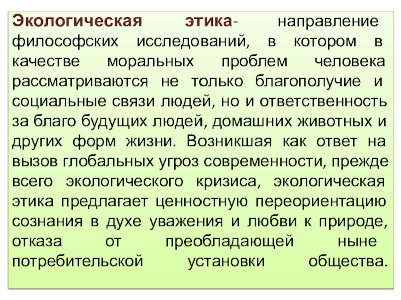 человека рассматриваются не только благополучие и социальные связи людей, но и ответственность за благо будущих людей, домашних животных и других форм жизни. Возникшая как ответ на вызов глобальных угроз современности, прежде всего экологического кризиса, экологическая этика предлагает ценностную переориентацию сознания в духе уважения и любви к природе, отказа от преобладающей ныне потребительской установки общества.