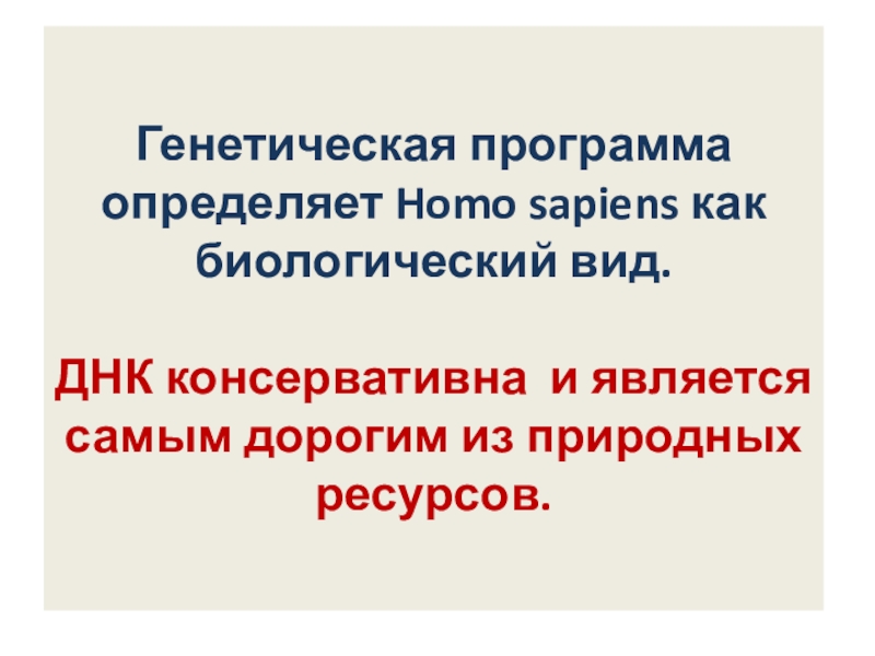 Генетическая программа определяет Homo sapiens как биологический вид.   ДНК консервативна и является самым дорогим из