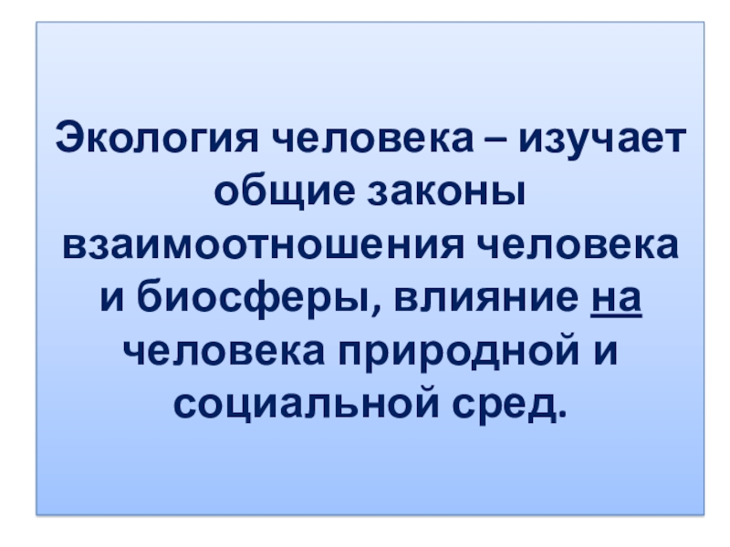 Слайд 7Экология человека – изучает общие законы взаимоотношения человека и биосферы, влияние
