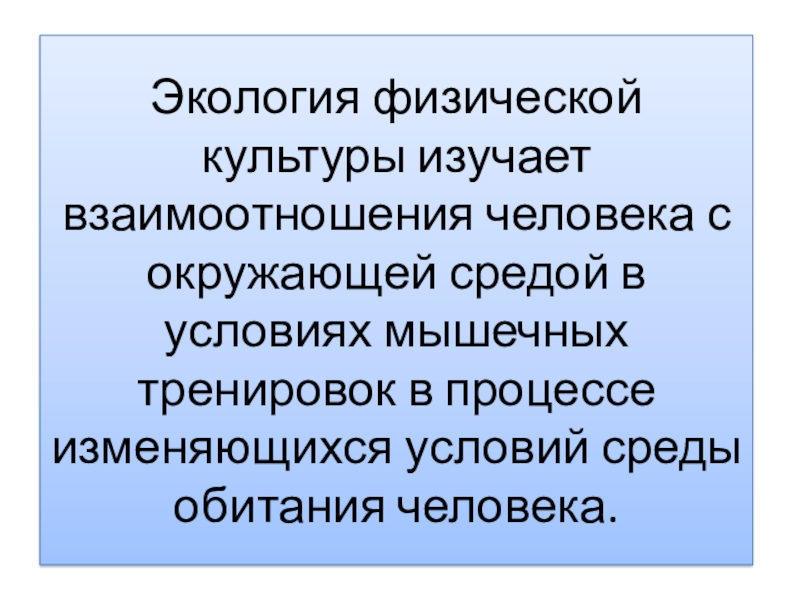 Экология физической культуры изучает взаимоотношения человека с окружающей средой в условиях мышечных тренировок в процессе изменяющихся условий