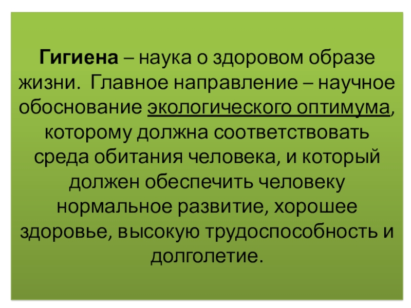 Гигиена – наука о здоровом образе жизни. Главное направление – научное обоснование экологического оптимума, которому должна соответствовать