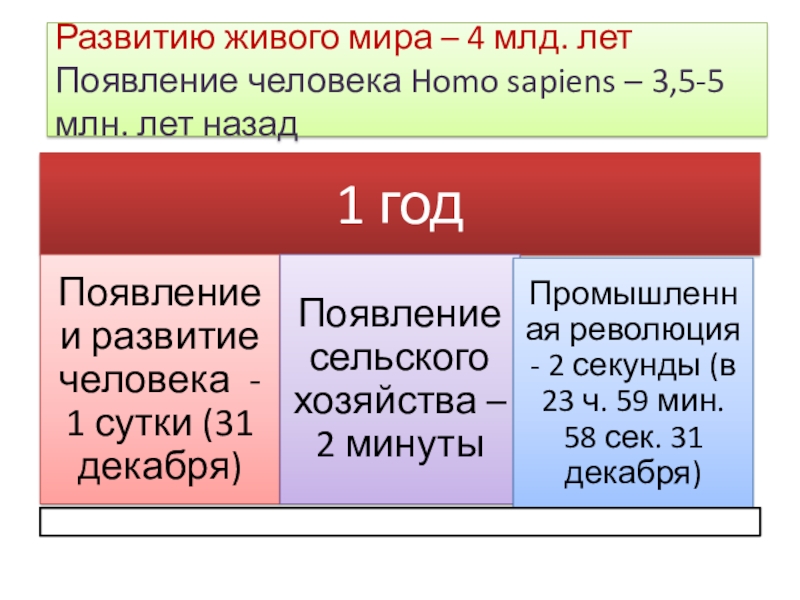 Развитию живого мира – 4 млд. лет Появление человека Homo sapiens – 3,5-5 млн. лет назад