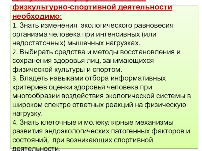 Слайд 23Для успешной профессиональной физкультурно-спортивной деятельности необходимо: 1. Знать изменения экологического равновесия организма