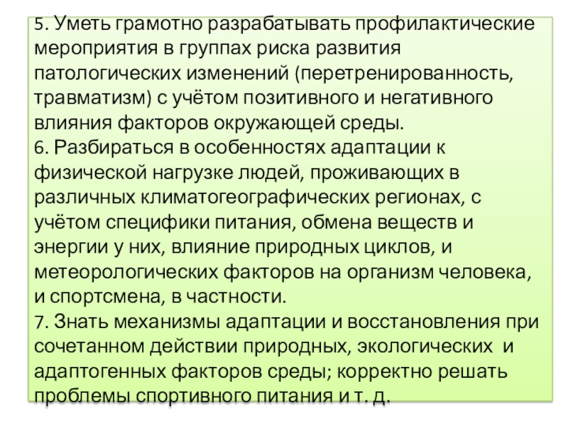 изменений (перетренированность, травматизм) с учётом позитивного и негативного влияния факторов окружающей среды. 6. Разбираться в особенностях адаптации к физической нагрузке людей, проживающих в различных климатогеографических регионах, с учётом специфики питания, обмена веществ и энергии у них, влияние природных циклов, и метеорологических факторов на организм человека, и спортсмена, в частности. 7. Знать механизмы адаптации и восстановления при сочетанном действии природных, экологических и адаптогенных факторов среды; корректно решать проблемы спортивного питания и т. д.