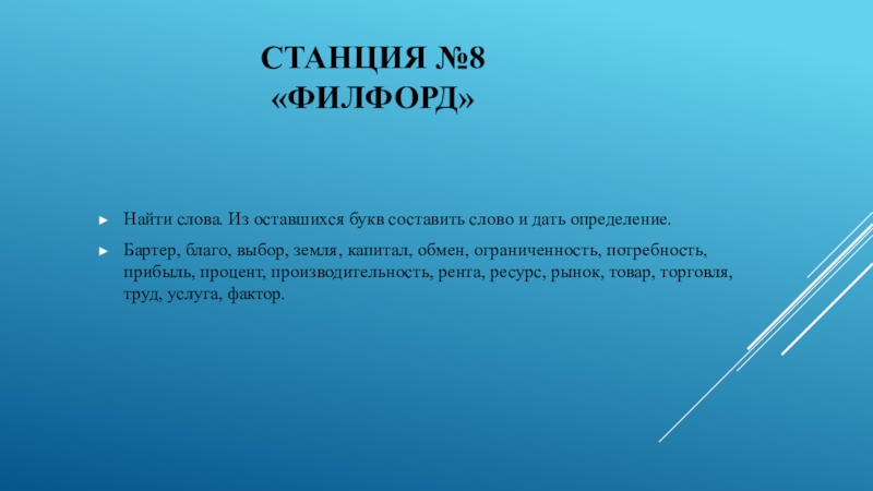 Бартер, благо, выбор, земля, капитал, обмен, ограниченность, потребность, прибыль, процент, производительность, рента, ресурс, рынок, товар, торговля, труд, услуга, фактор.