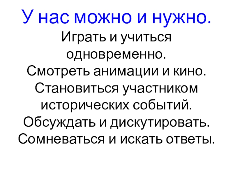 Слайд 54У нас можно и нужно. Играть и учиться одновременно. Смотреть анимации и кино. Становиться