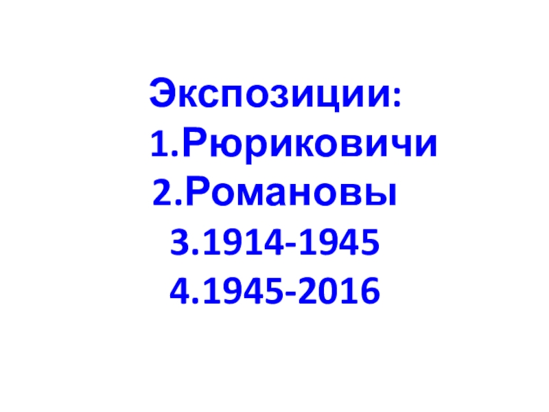 Слайд 52Экспозиции: 1.Рюриковичи 2.Романовы 3.1914-1945 4.1945-2016