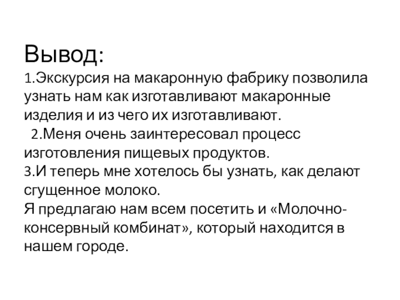и из чего их изготавливают. 2.Меня очень заинтересовал процесс изготовления пищевых продуктов. 3.И теперь мне хотелось бы узнать, как делают сгущенное молоко. Я предлагаю нам всем посетить и «Молочно-консервный комбинат», который находится в нашем городе.