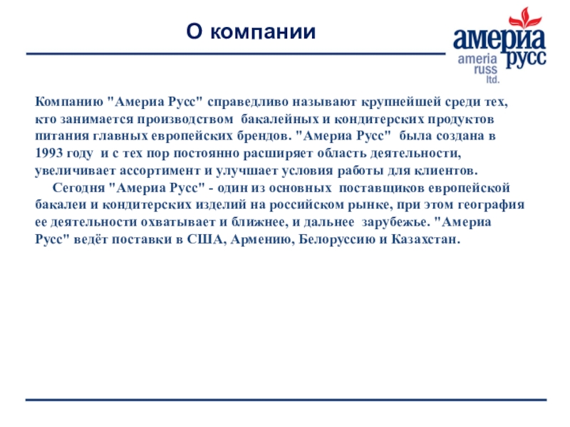 производством бакалейных и кондитерских продуктов питания главных европейских брендов. "Америа Русс"  была создана в 1993 году  и с тех пор постоянно расширяет область деятельности, увеличивает ассортимент и улучшает условия работы для клиентов.
