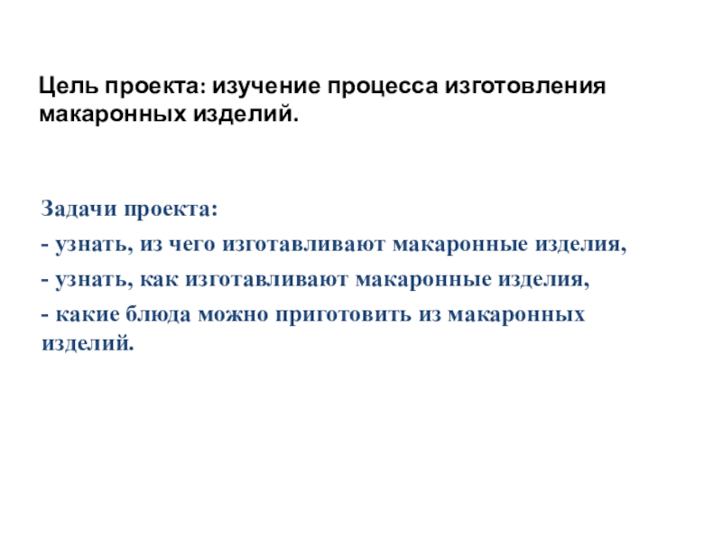 Цель проекта: изучение процесса изготовления макаронных изделий. Задачи проекта: - узнать, из чего изготавливают макаронные изделия,- узнать,