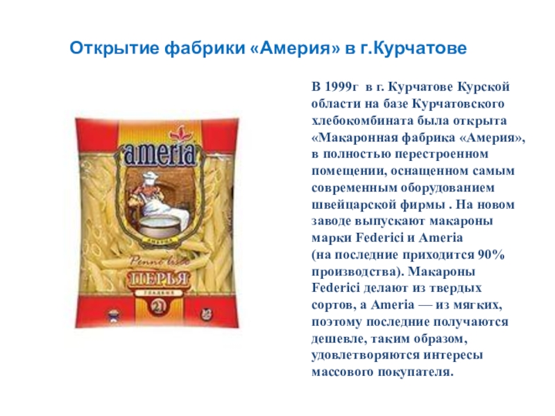 Открытие фабрики «Америя» в г.КурчатовеВ 1999г в г. Курчатове Курской области на базе Курчатовского хлебокомбината была открыта «Макаронная фабрика «Америя»,