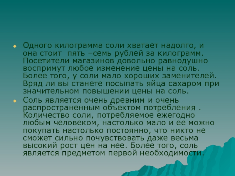 за килограмм. Посетители магазинов довольно равнодушно воспримут любое изменение цены на соль. Более того, у соли мало хороших заменителей. Вряд ли вы станете посыпать яйца сахаром при значительном повышении цены на соль.