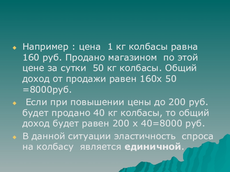 Если при повышении цены до 200 руб. будет продано 40 кг колбасы, то общий доход будет равен 200 x 40=8000 руб.