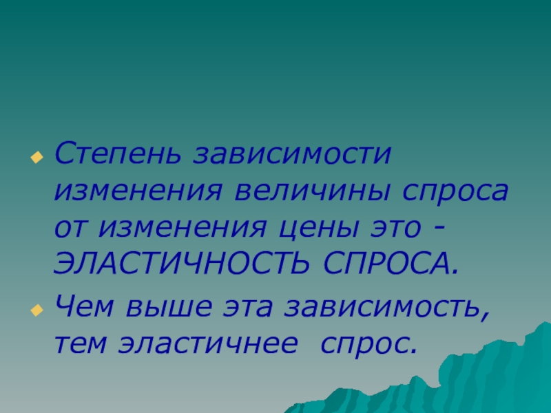 Степень зависимости изменения величины спроса от изменения цены это - ЭЛАСТИЧНОСТЬ СПРОСА.Чем выше эта зависимость, тем эластичнее