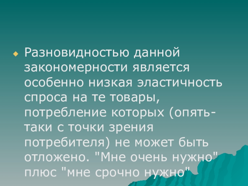 Разновидностью данной закономерности является особенно низкая эластичность спроса на те товары, потребление которых (опять-таки с точки зрения
