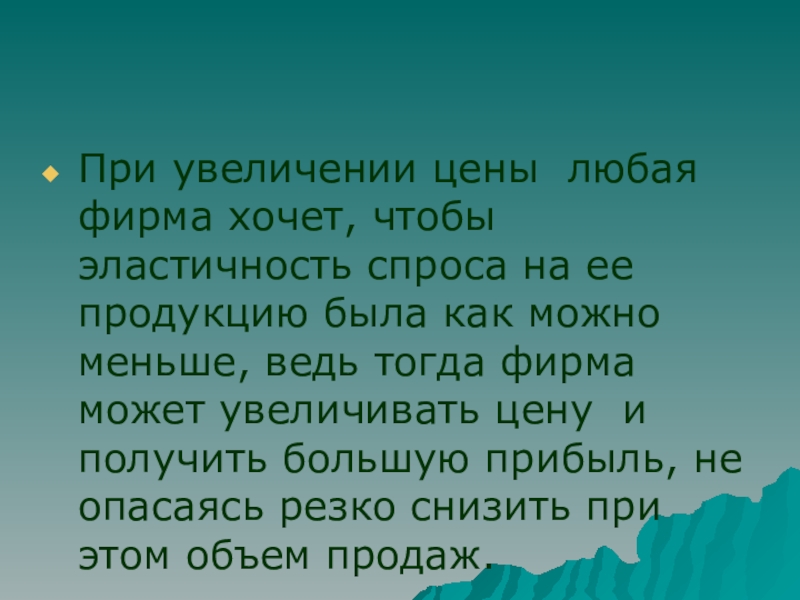 При увеличении цены любая фирма хочет, чтобы эластичность спроса на ее продукцию была как можно меньше, ведь