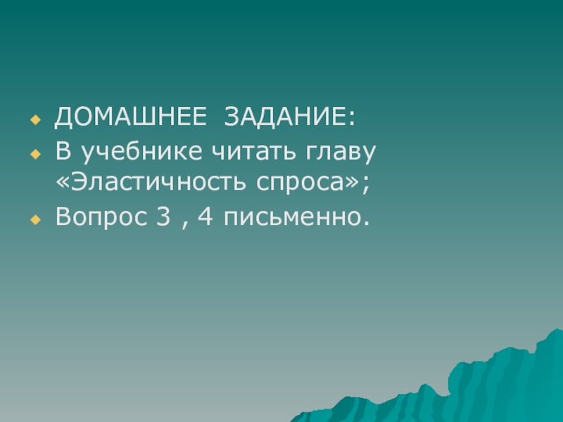 ДОМАШНЕЕ ЗАДАНИЕ:В учебнике читать главу «Эластичность спроса»;Вопрос 3 , 4 письменно.
