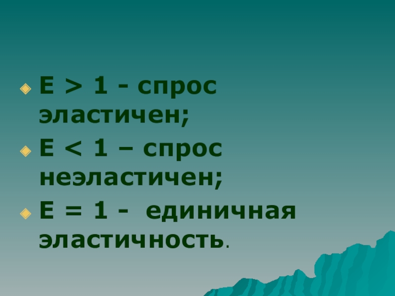 E > 1 - спрос эластичен;E < 1 – спрос неэластичен;E = 1 - единичная эластичность.