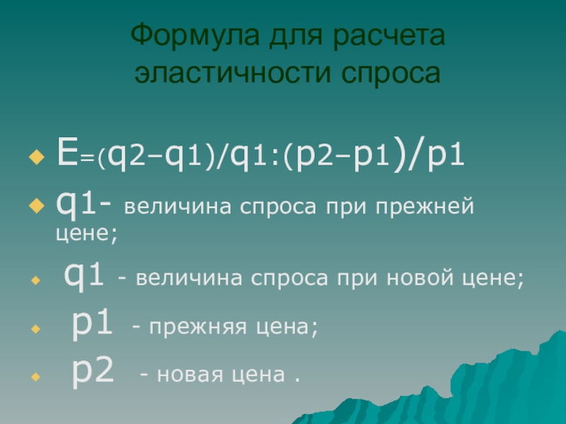 Формула для расчета эластичности спросаE=(q2–q1)/q1:(p2–p1)/p1q1- величина спроса при прежней цене; q1 - величина спроса при новой цене;