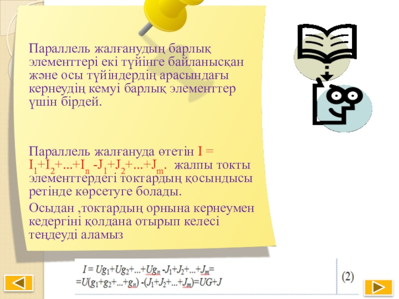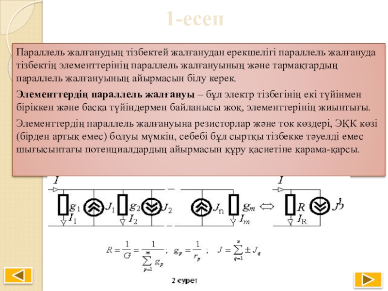 Слайд 7Параллель жалғанудың барлық элементтері екі түйінге байланысқан және осы түйіндердің арасындағы