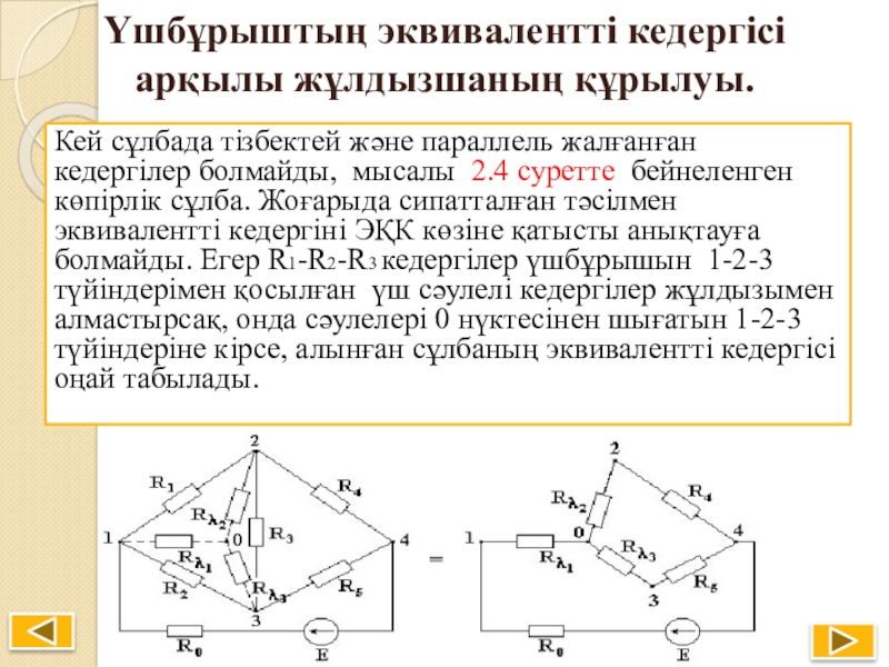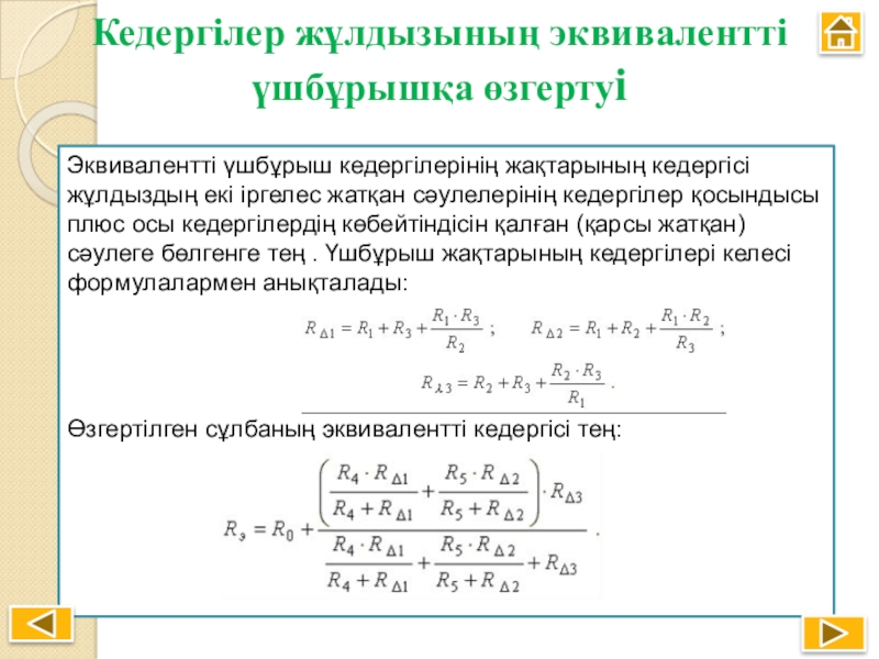 Слайд 26Кедергiлер жұлдызының эквивалентті үшбұрышқа өзгертуi