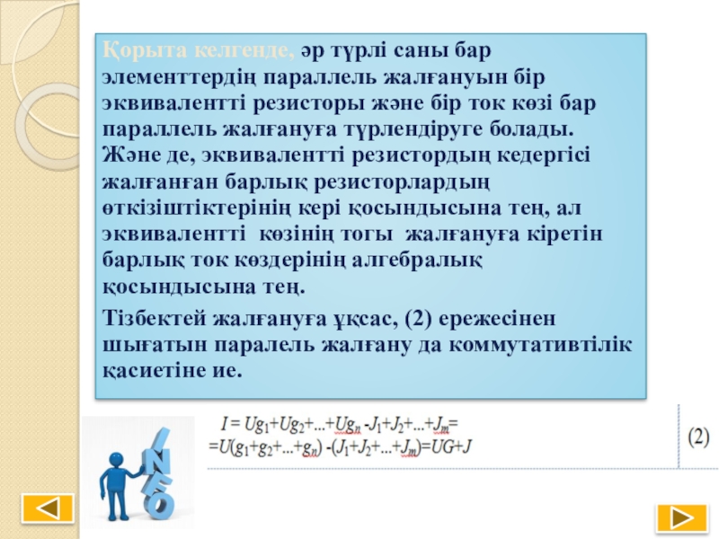 Слайд 8Қорыта келгенде, әр түрлі саны бар элементтердің параллель жалғануын бір эквивалентті