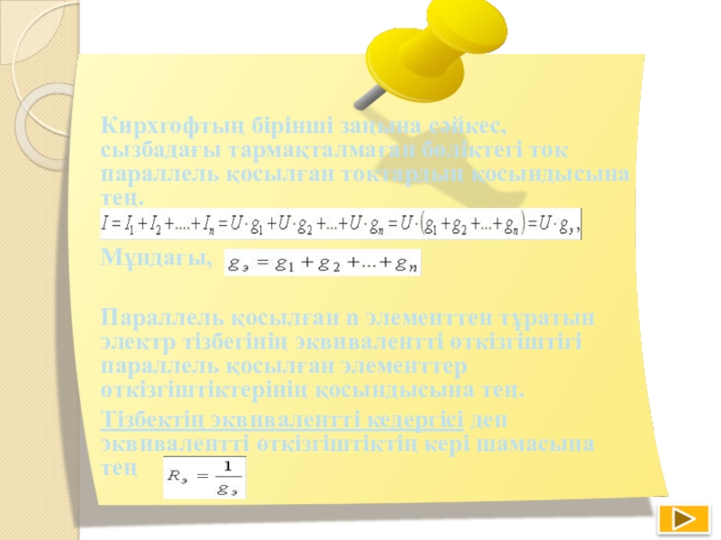 Слайд 9Параллель жалғану кезінде бөлек элементтердің өткізгіштіктерінің қосындысы болатын G эквивалентті өткізгіштігіне