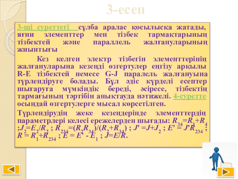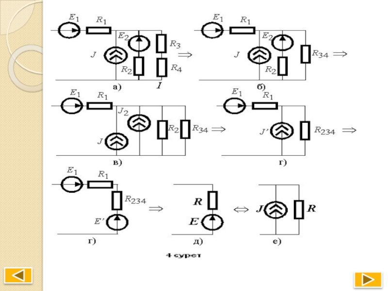Түрлендірудің жеке кезеңдерінде элементтердің параметрлері келесі ережелерден шығады: R34=R3+R4 ;J2=E2/R2 ; R234=(R2R34)/(R2+R34) ; J' =J+J2 ; E' = J'R234 ; R = R1+R234 ; E = E' - E1 ; J=E/R.