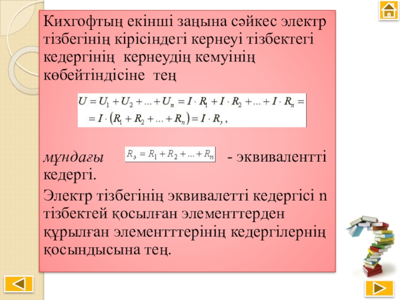 Слайд 17Кихгофтың екінші заңына сәйкес электр тізбегінің кірісіндегі кернеуі тізбектегі кедергінің кернеудің