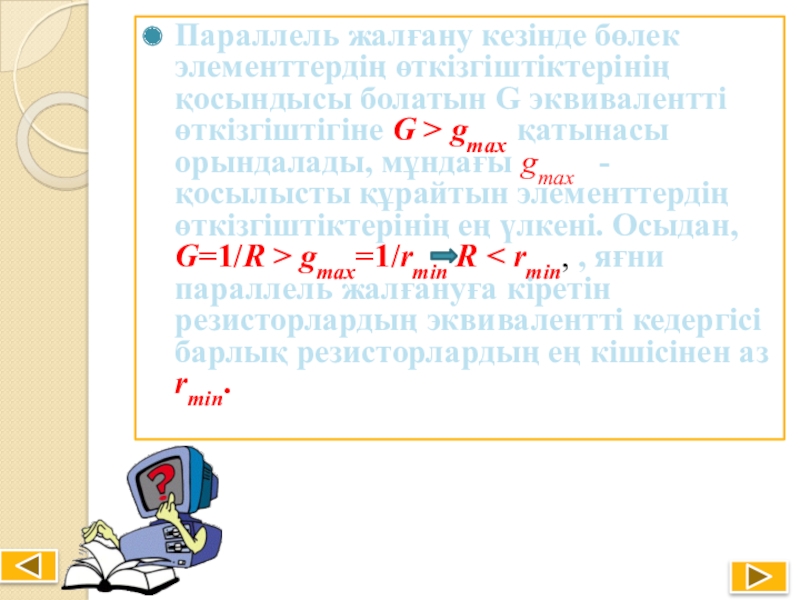 G > gmax қатынасы орындалады, мұндағы gmax - қосылысты құрайтын элементтердің өткізгіштіктерінің ең үлкені. Осыдан, G=1/R > gmax=1/rmin R < rmin, , яғни параллель жалғануға кіретін резисторлардың эквивалентті кедергісі барлық резисторлардың ең кішісінен аз rmin.