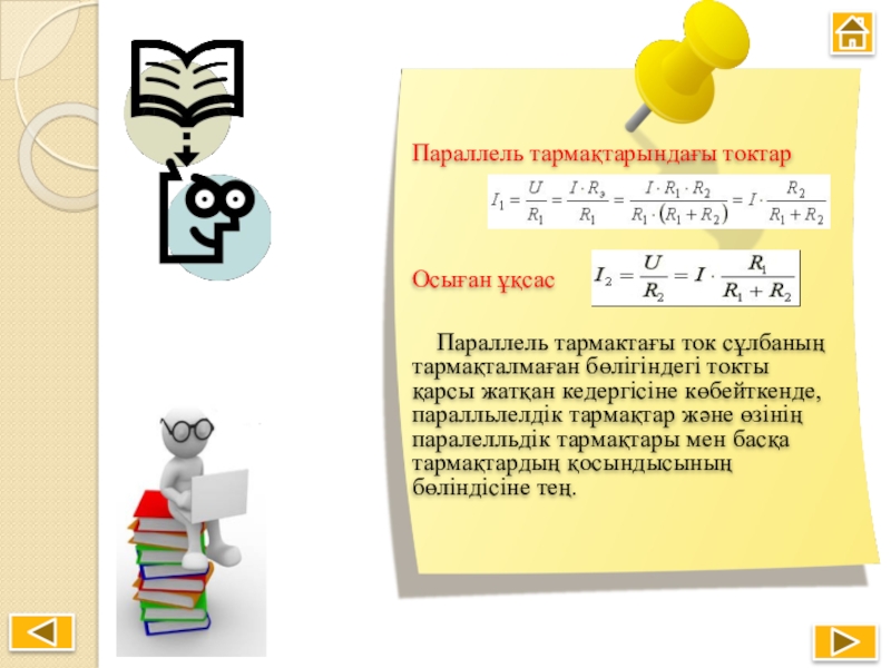 Слайд 19Кирхгофтың бірінші заңына сәйкес, сызбадағы тармақталмаған бөліктегі ток параллель қосылған токтардың