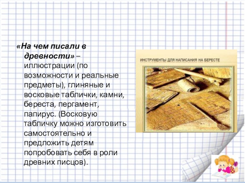 предметы), глиняные и восковые таблички, камни, береста, пергамент, папирус. (Восковую табличку можно изготовить самостоятельно и предложить детям попробовать себя в роли древних писцов).