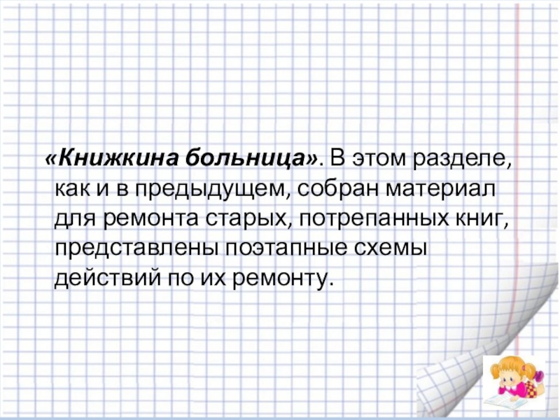 предыдущем, собран материал для ремонта старых, потрепанных книг, представлены поэтапные схемы действий по их ремонту.