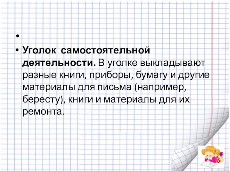 Уголок самостоятельной деятельности. В уголке выкладывают разные книги, приборы, бумагу и