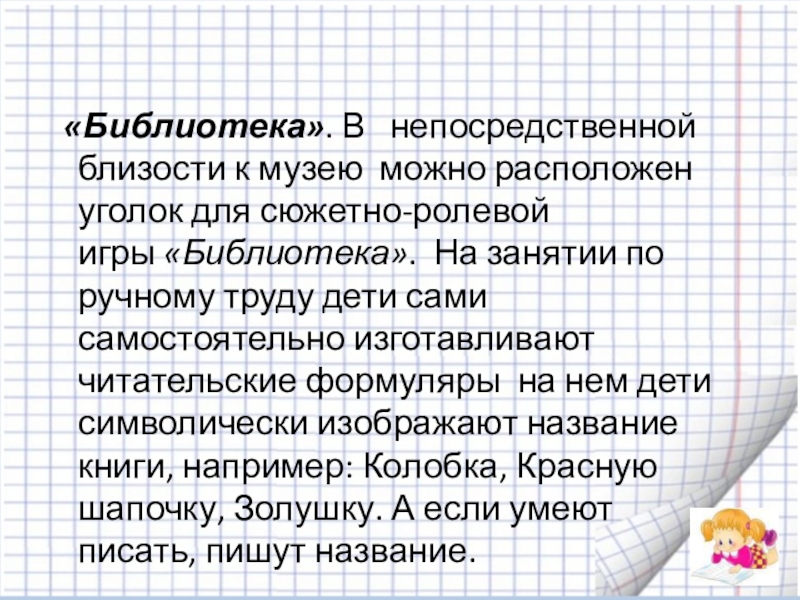 Слайд 14 «Библиотека». В непосредственной близости к музею можно расположен уголок