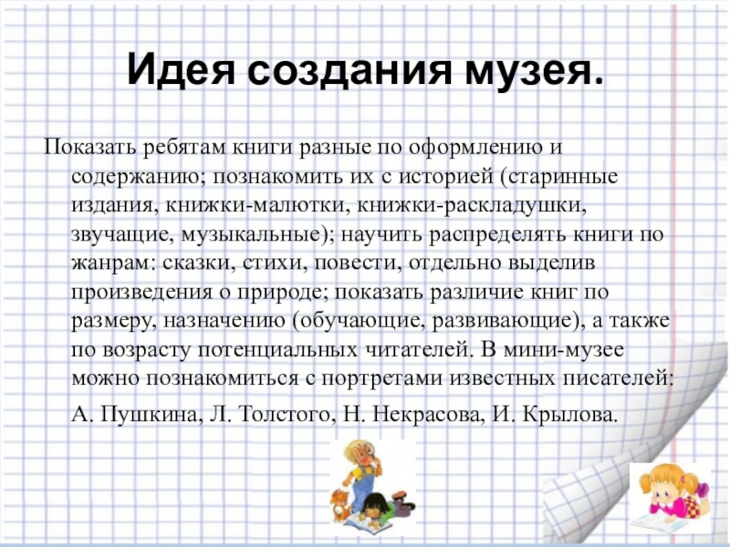 их с историей (старинные издания, книжки-малютки, книжки-раскладушки, звучащие, музыкальные); научить распределять книги по жанрам: сказки, стихи, повести, отдельно выделив произведения о природе; показать различие книг по размеру, назначению (обучающие, развивающие), а также по возрасту потенциальных читателей. В мини-музее можно познакомиться с портретами известных писателей: А. Пушкина, Л. Толстого, Н. Некрасова, И. Крылова.