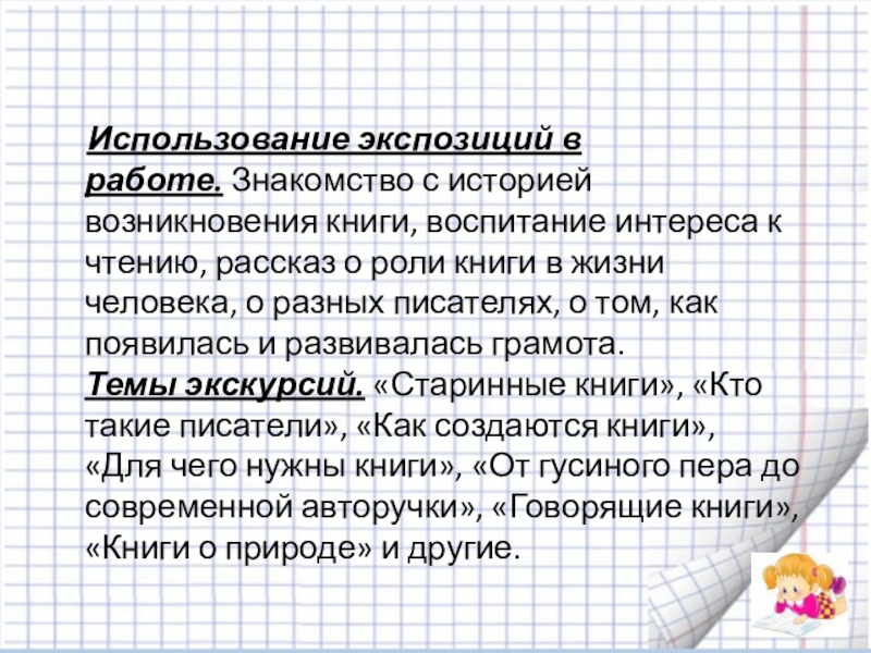 Слайд 15 Использование экспозиций в работе. Знакомство с историей возникновения книги, воспитание