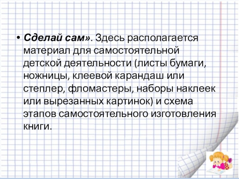 Слайд 12Сделай сам». Здесь располагается материал для самостоятельной детской деятельности (листы бумаги,