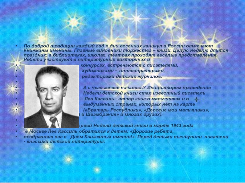отмечают Книжкины именины. Главные виновники торжества – книги. Целую неделю длится праздник: в библиотеках, школах, театрах проходят весёлые представления. Ребята участвуют в литературных викторинах и