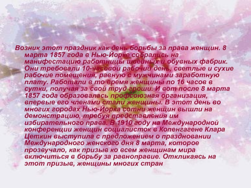 1857 года в Нью-Йорке собрались на манифестацию работницы швейных и обувных фабрик. Они требовали 10-часовой рабочий день, светлые и сухие рабочие помещения, равную с мужчинами заработную плату. Работали в то время женщины по 16 часов в сутки, получая за свой труд гроши. И вот после 8 марта 1857 года образовалась профсоюзная организация, впервые его членами стали женщины. В этот день во многих городах Нью-Йорка сотни женщин вышли на демонстрацию, требуя представления им избирательного права. В 1910 году на Международной конференции женщин социалисток в Копенгагене Клара Цеткин выступила с предложением о праздновании Международного женского дня 8 марта, которое прозвучало, как призыв ко всем женщинам мира включиться в борьбу за равноправие. Откликаясь на этот призыв, женщины многих стран