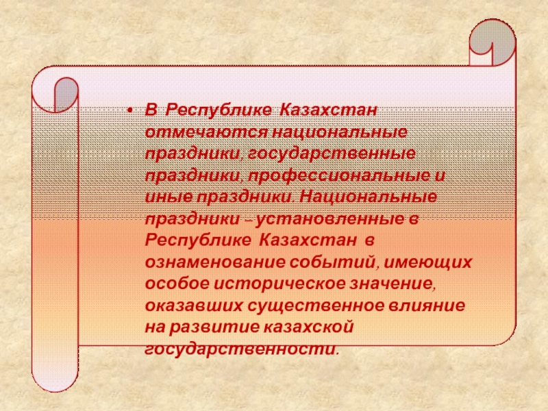 праздники. Национальные праздники – установленные в Республике Казахстан в ознаменование событий, имеющих особое историческое значение, оказавших существенное влияние на развитие казахской государственности.