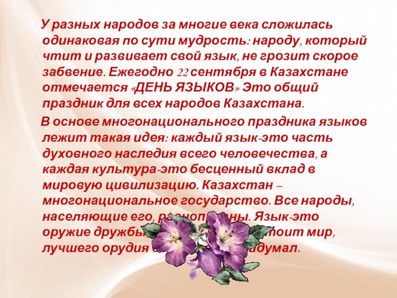 В основе многонационального праздника языков лежит такая идея: каждый язык-это часть духовного наследия всего человечества, а каждая культура-это бесценный вклад в мировую цивилизацию. Казахстан – многонациональное государство. Все народы, населяющие его, равноправны. Язык-это оружие дружбы, и , с тех пор как стоит мир, лучшего орудия ее никто не придумал.