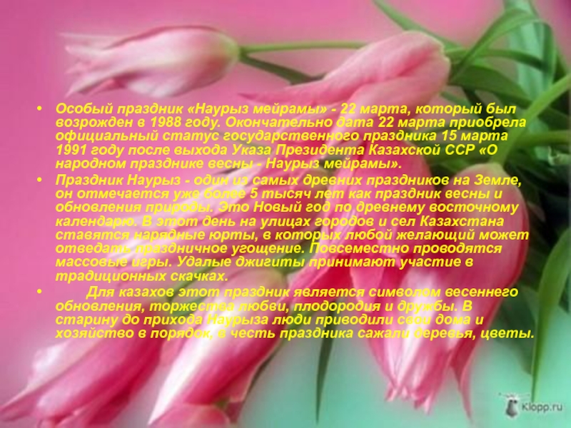 1988 году. Окончательно дата 22 марта приобрела официальный статус государственного праздника 15 марта 1991 году после выхода Указа Президента Казахской ССР «О народном празднике весны - Наурыз мейрамы».
