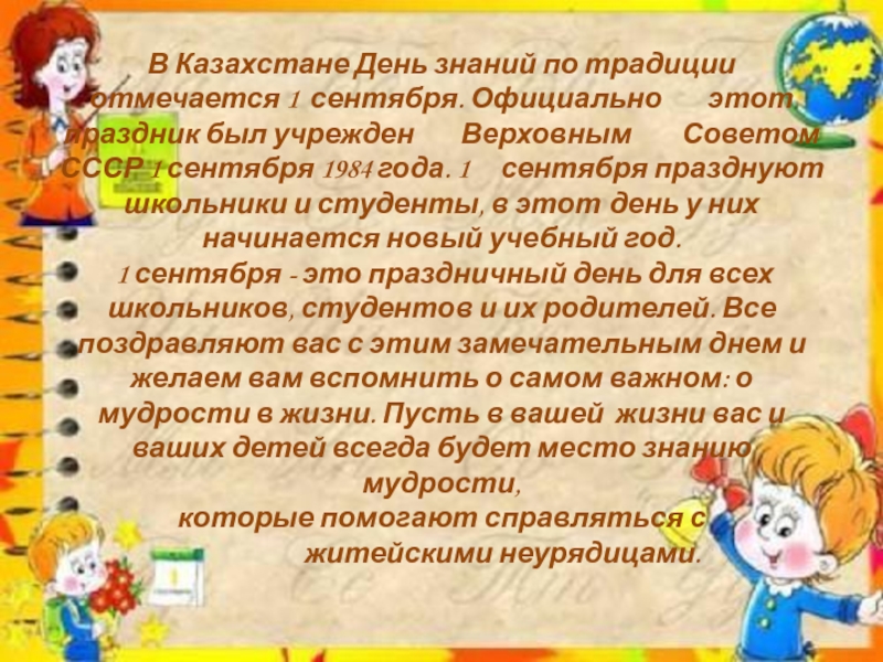Слайд 26В Казахстане День знаний по традиции отмечается 1 сентября. Официально