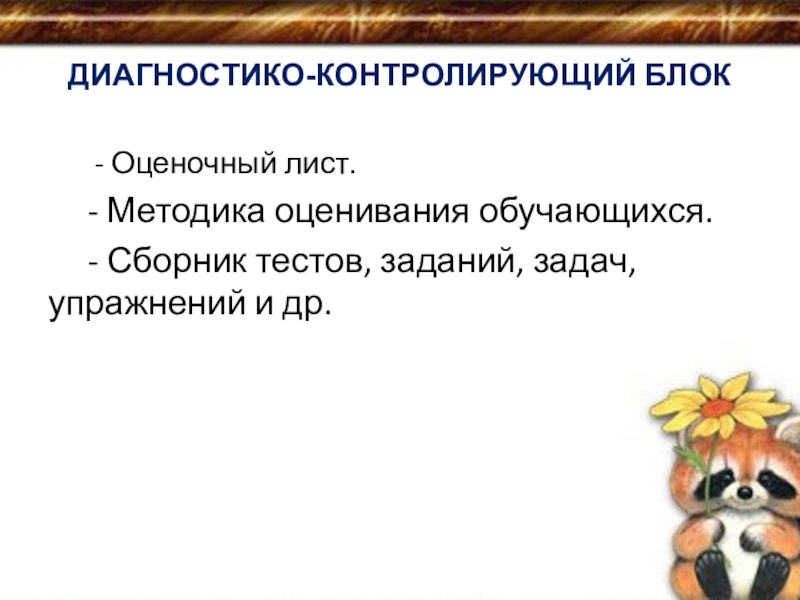 ДИАГНОСТИКО-КОНТРОЛИРУЮЩИЙ БЛОК - Оценочный лист.   - Методика оценивания обучающихся.   - Сборник тестов, заданий, задач,