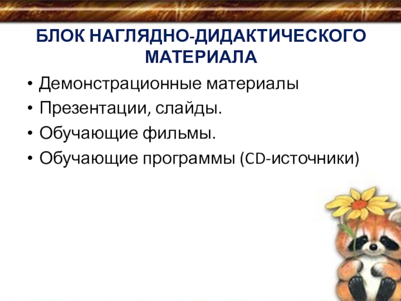 БЛОК НАГЛЯДНО-ДИДАКТИЧЕСКОГО МАТЕРИАЛАДемонстрационные материалы Презентации, слайды. Обучающие фильмы. Обучающие программы (CD-источники)