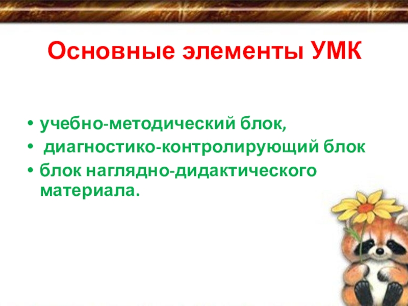 Основные элементы УМКучебно-методический блок, диагностико-контролирующий блок блок наглядно-дидактического материала.