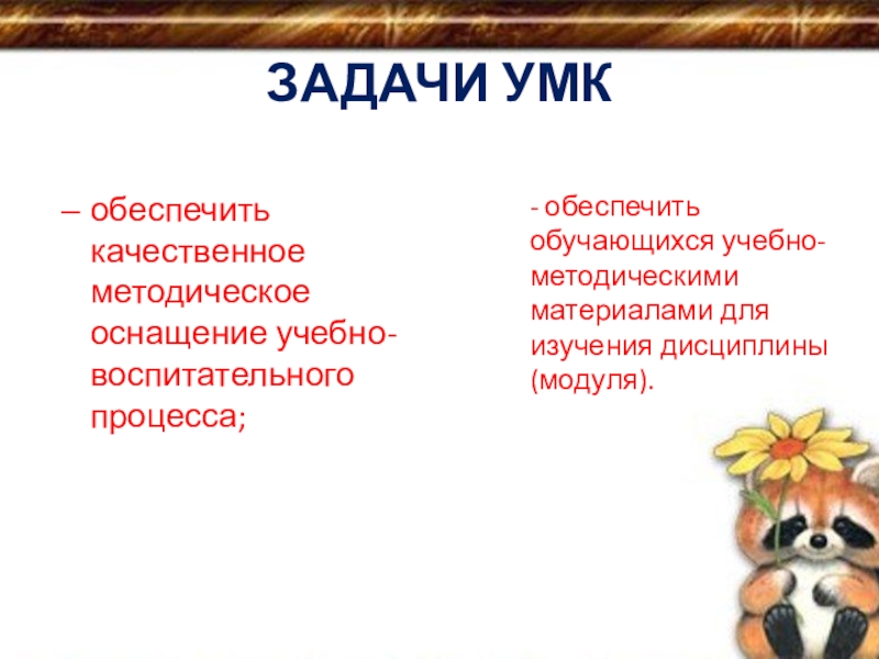ЗАДАЧИ УМКобеспечить качественное методическое оснащение учебно-воспитательного процесса;  - обеспечить обучающихся учебно-методическими материалами для изучения дисциплины (модуля).
