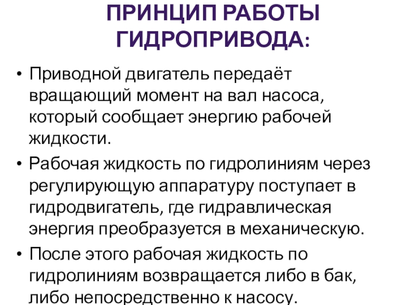 Принцип работы гидропривода:Приводной двигатель передаёт вращающий момент на вал насоса, который сообщает энергию рабочей жидкости.Рабочая жидкость по гидролиниям через регулирующую аппаратуру